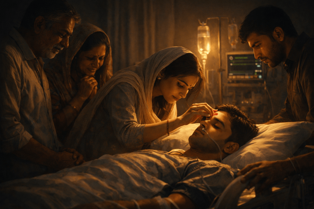 A family stood around a hospital bed in Ghaziabad. No one spoke loudly. No one cried. The silence felt heavier than grief itself.